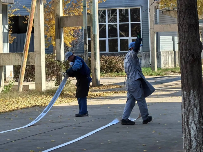 此外,在安全人員的組織下,干部職工還在消防水帶演習(xí)場所,現(xiàn)場連接消防水帶,實(shí)際演習(xí)了用消防水帶滅火的過程。
