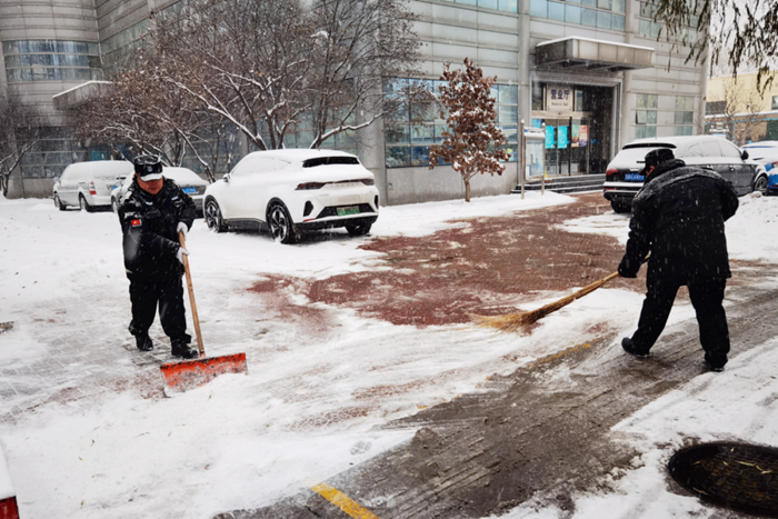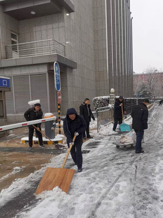 大雪壓城,華騰拓展公司迅速響應(yīng),每天派出50余名職工進(jìn)行掃雪鏟冰行動(dòng)。為了確保在寫(xiě)字樓中辦公的客戶出行和業(yè)務(wù)不受影響,華騰拓展職工冒雪開(kāi)展掃雪鏟冰工作,并對(duì)主要路段使用融雪劑進(jìn)行融雪作業(yè),防止結(jié)冰打滑產(chǎn)生安全事故。