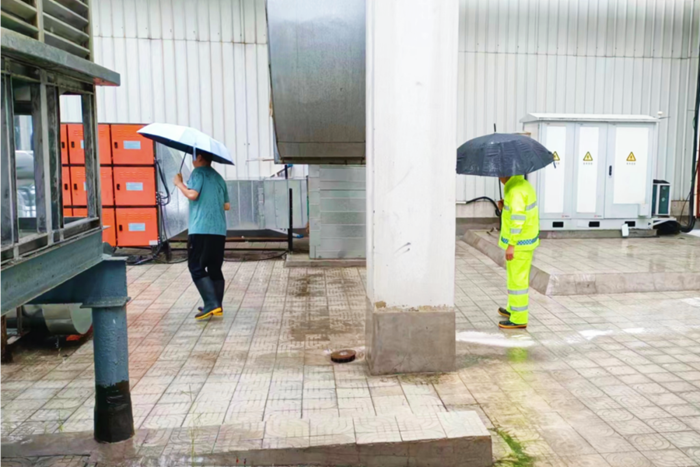 7月30日,屬地普降大雨,廠區(qū)出現(xiàn)大量積水,為防止再次降雨造成水位升高,雨水進(jìn)入庫(kù)房等重點(diǎn)區(qū)域,公司領(lǐng)導(dǎo)帶領(lǐng)安全干部隊(duì)伍趕赴一線,親力親為,對(duì)廠區(qū)排水口、井箅子等積存污泥進(jìn)行及時(shí)清除,加裝水泵以加快廠區(qū)雨水排放,做到雨停路凈。