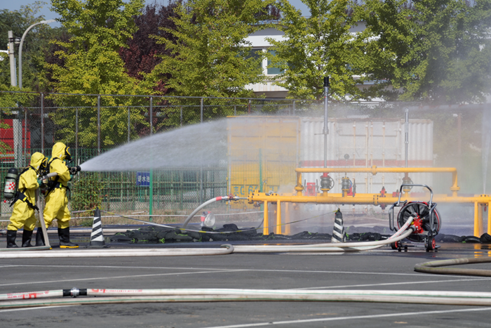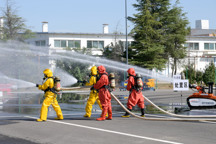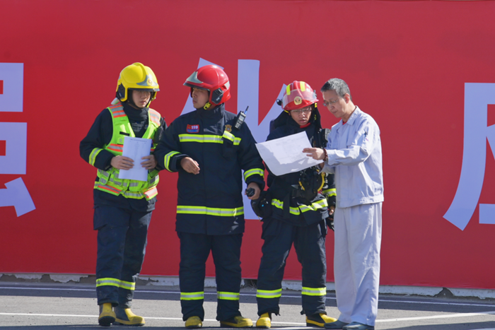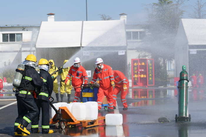 演練緊張而有序,周邊有毒有害氣體濃度監(jiān)測和偵檢、事故現(xiàn)場火災(zāi)撲救、空氣中可燃氣體和有毒有害氣體濃度稀釋、泄漏危險化學(xué)品輸送管道堵漏……環(huán)環(huán)相扣、環(huán)環(huán)跟進。